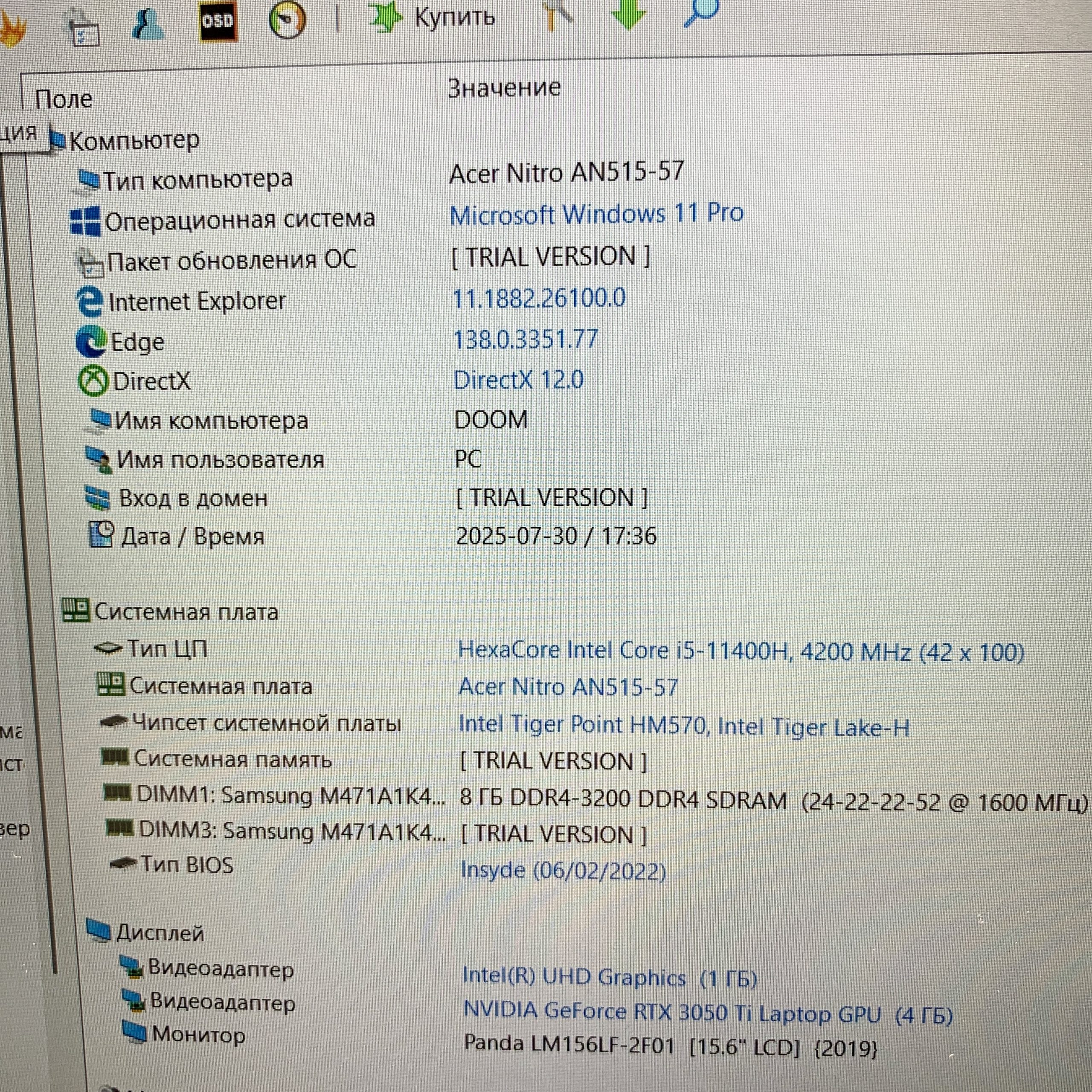 | Производитель ноутбука | Acer |