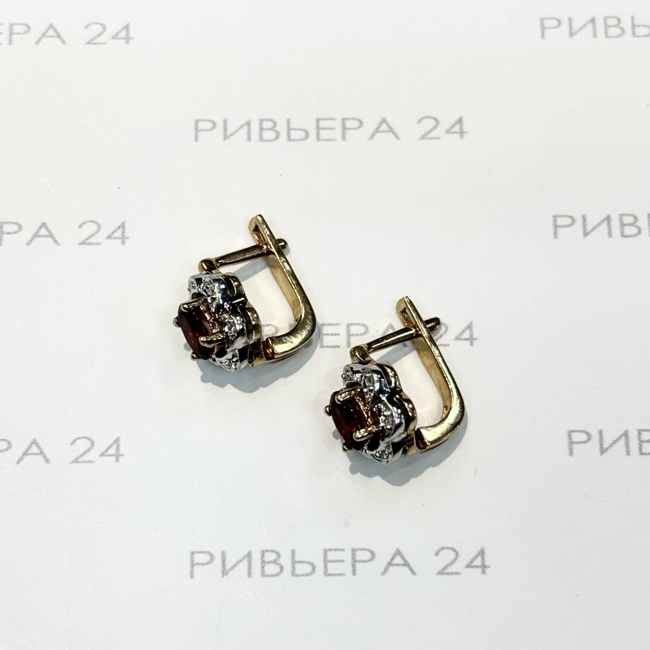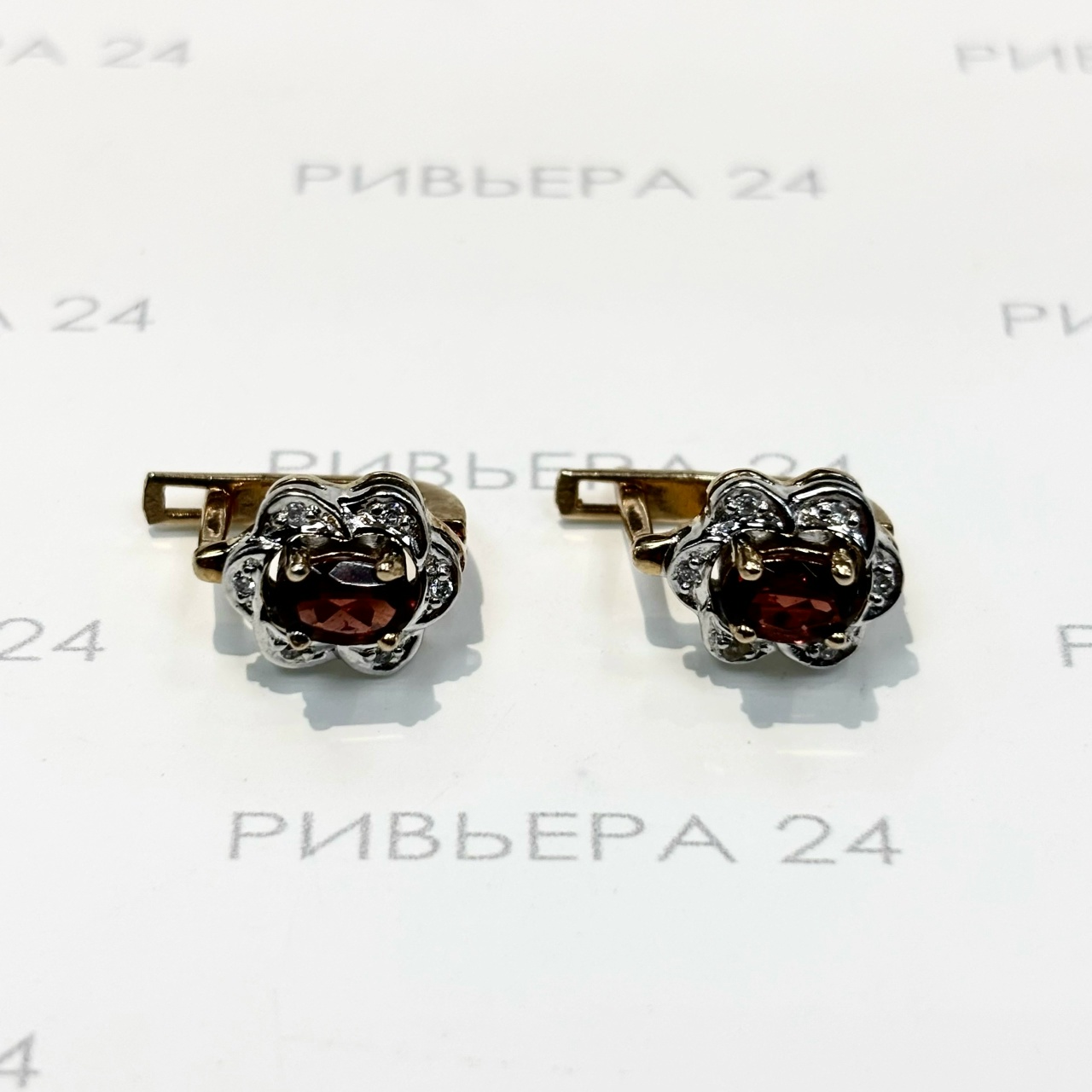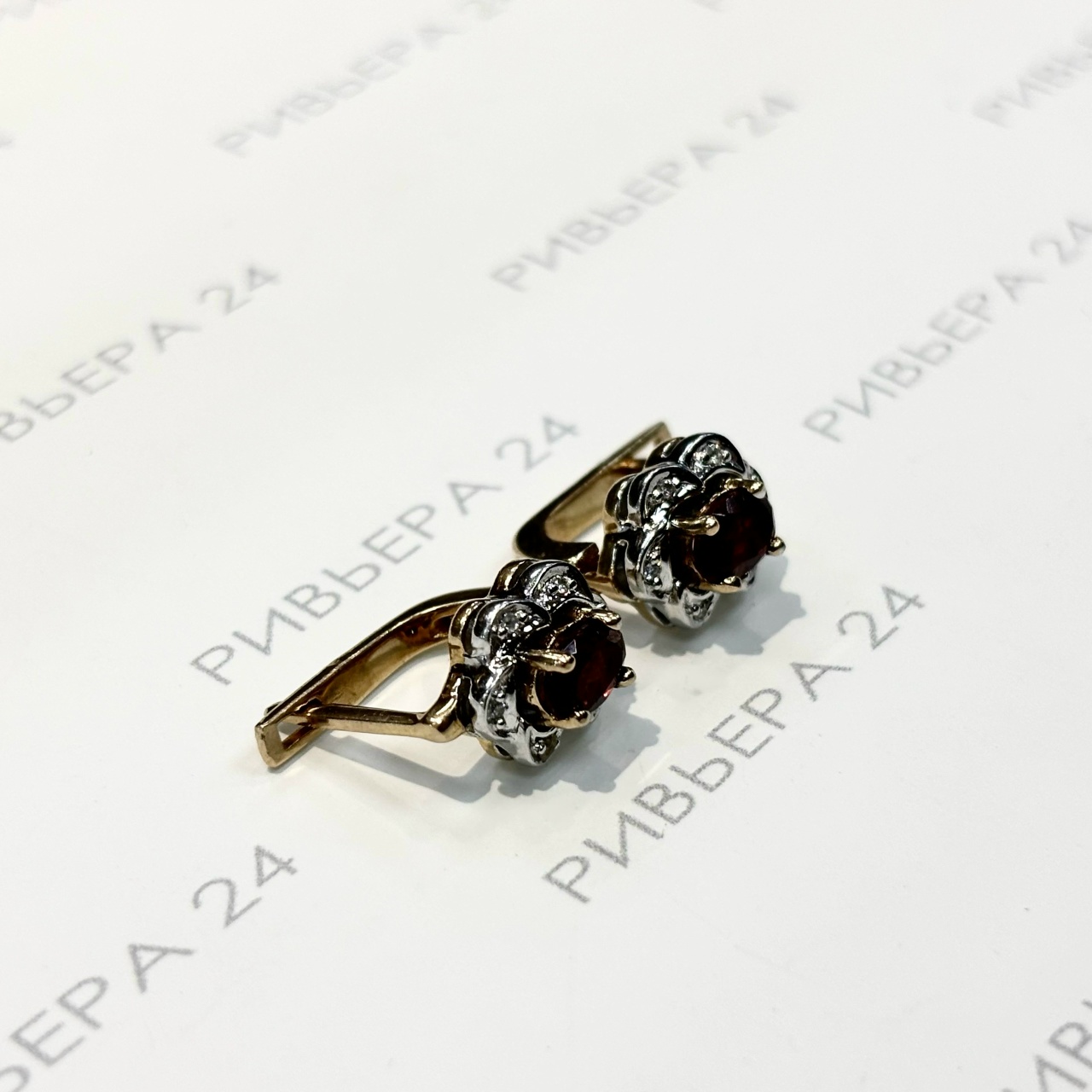 Золотые серьги с гранатом и бриллиантами 585 пробы 5,28 грамма Золото 585 пробы.