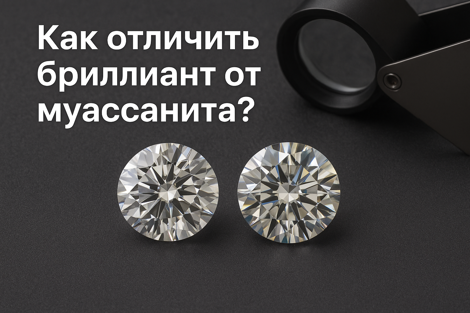 Фото с двумя круглым огранёнными камнями — бриллиантом слева и муассанитом справа на тёмном фоне рядом с ювелирной лупой1. Внешний блеск и огонь:
